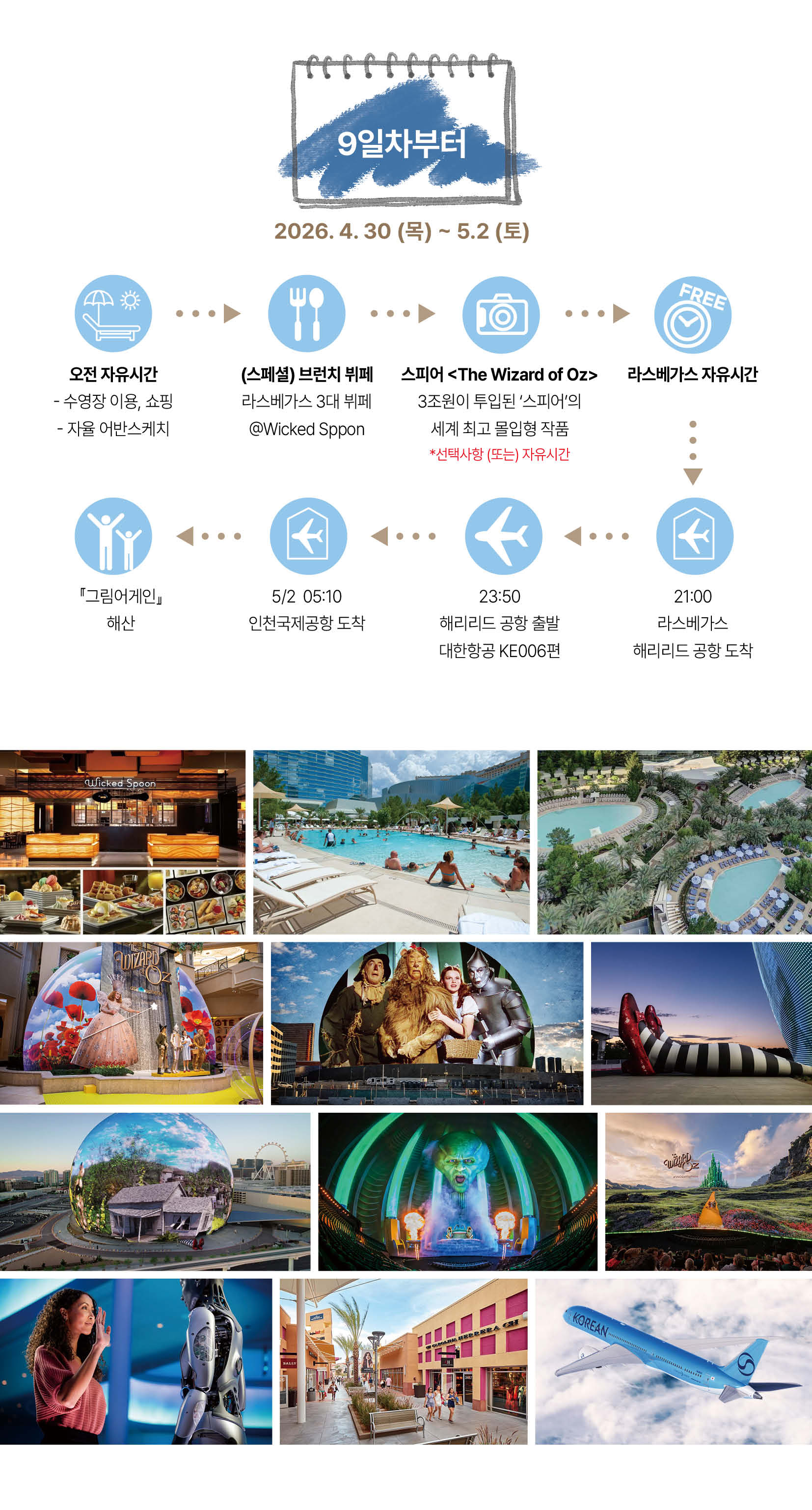 • 전 일정 조식, 중식 5회, 특석식 4회 포함 (라스베가스 3대 뷔페 위키드스푼 포함)